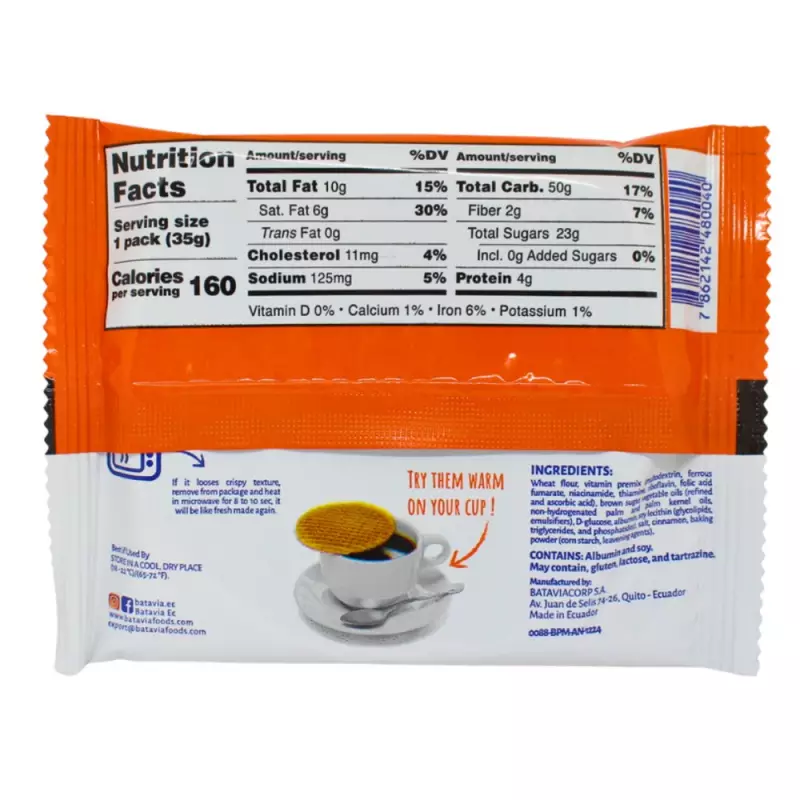 En BATAVIA, fusionamos la rica herencia holandesa con la pasión y la calidad ecuatorianas. Inspirados en la receta original de Gouda de 1810, elaboramos stroopwafels semiartesanales en nuestras instalaciones de Quito, ubicadas a 2800 metros sobre el nivel del mar. Con productos locales de alto valor. Cada galleta es el resultado de un proceso meticuloso que combina técnicas tradicionales con selectos ingredientes locales. Nuestro equipo, integrado principalmente por mujeres ecuatorianas, trabaja con dedicación para ofrecer un producto que refleja autenticidad y excelencia.