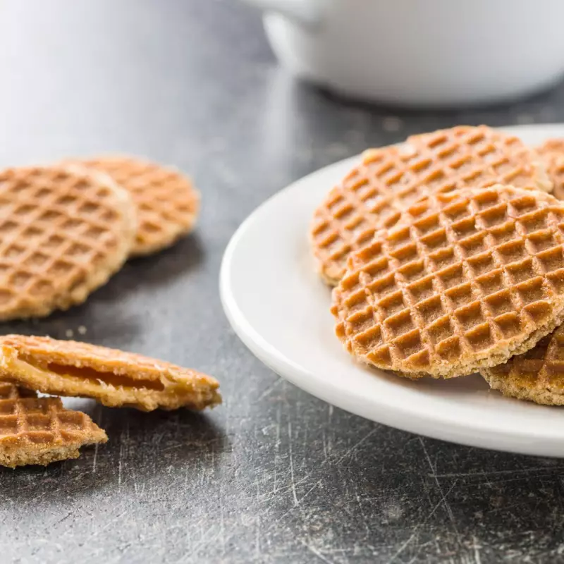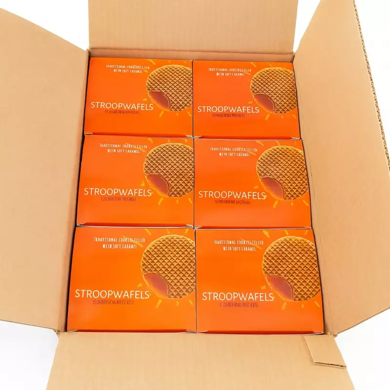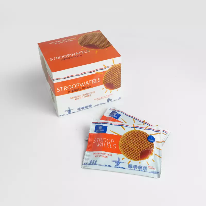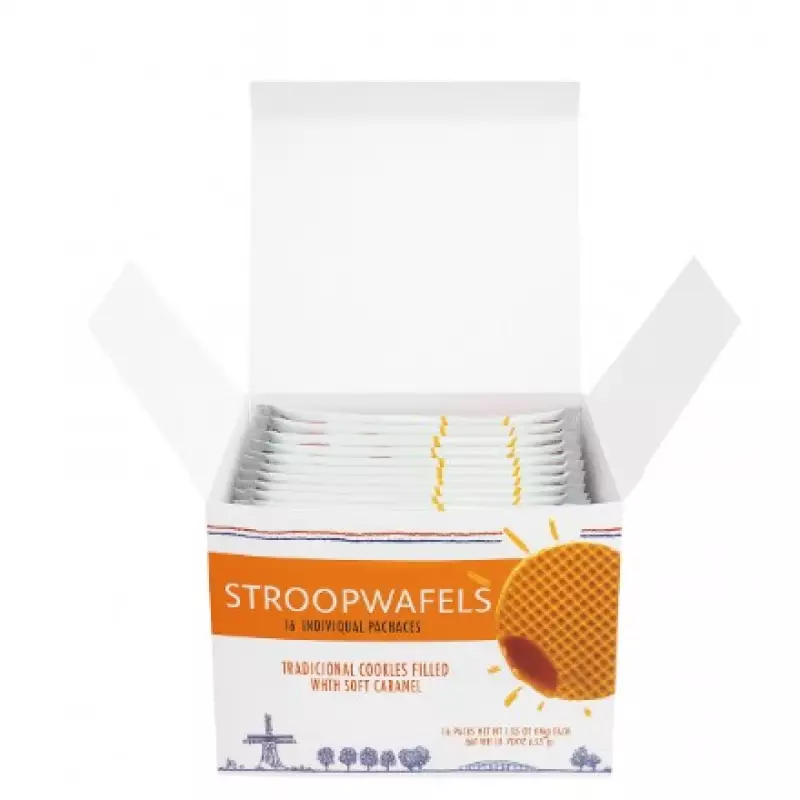 • Elaborado con dos finas y crujientes galletas tipo waffle rellenas de un delicioso caramelo, nuestro stroopwafels tradicional es el acompañante perfecto para tu café o te . Al colocar sobre tu taza caliente el relleno se suaviza y libera todo su aroma, creando una experiencia unica de sabor y textura