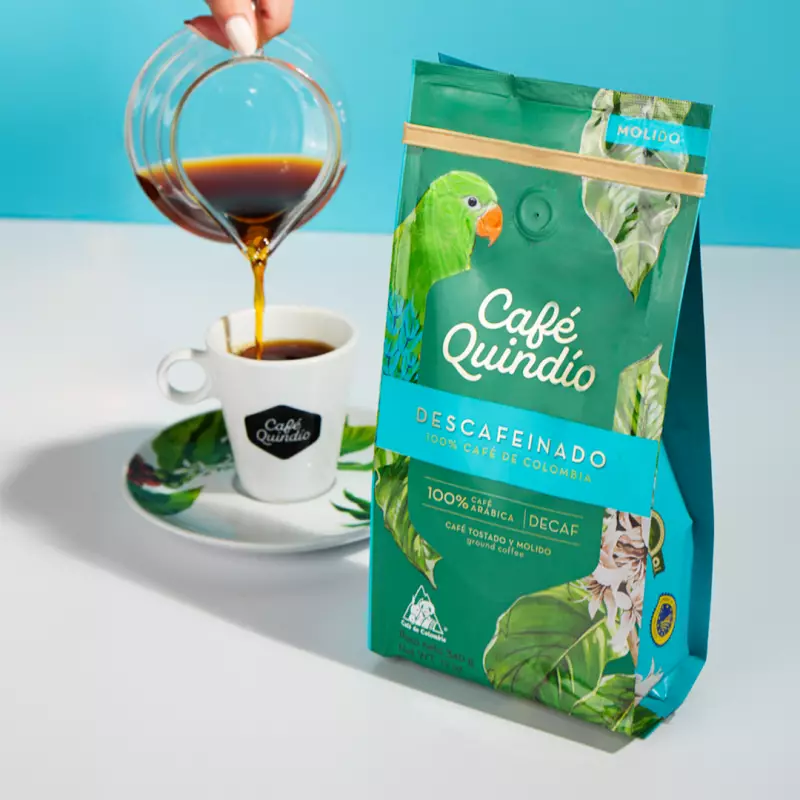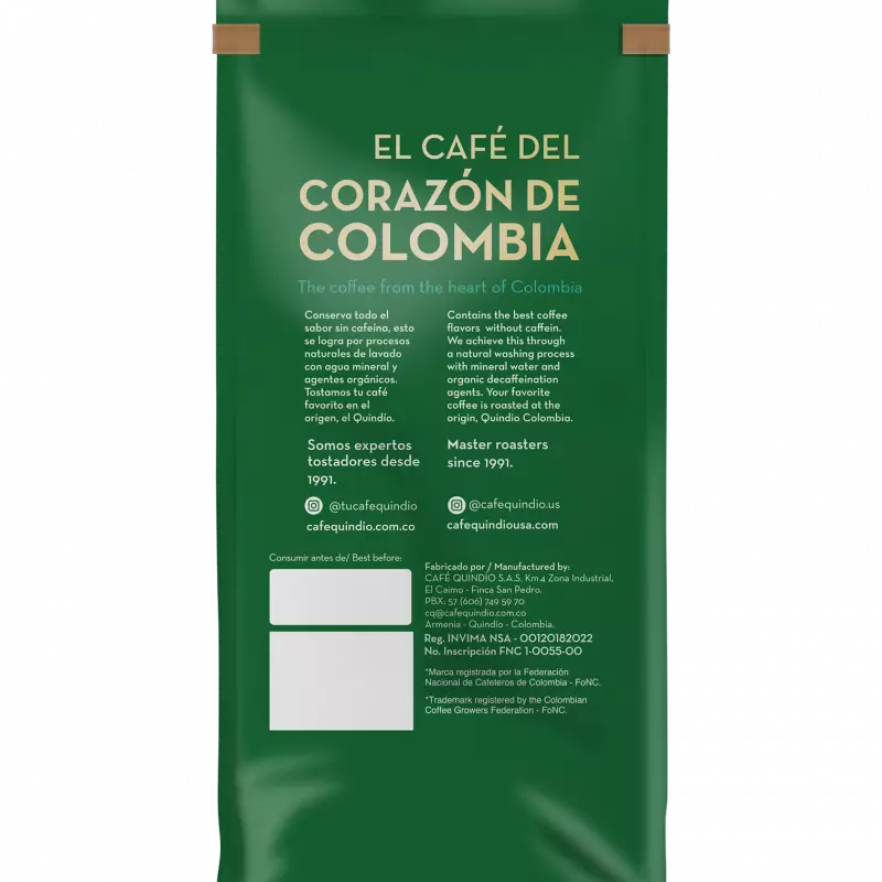 What was born as a dream, is now a reality, one in which over 400 employees work fully committed to offer you the best cup of coffee from local coffee growers roasted and packed at origin. Quindío State, from where our name comes from, is located is the center of Colombia, that´s why we call ourselves the “Coffee from the Heart of Colombia”. This strategic location gives our State the privilege of having flat terrain as well as the majestic Andes Mountains. This difference in altitudes, allows the region to offer different varieties of Arabica coffee, each with its unique characteristics of flavor, notes, body and texture. Decaf is a blend of different varieties (Colombia and Castillo) of coffee harvested at around 3937-5577 feet above sea level (1200-1700 m.a.s.l.), giving it its unique chocolate and plums flavor notes. Its medium roast with its medium-low acidity, offers you a cup of coffee with a medium body, residual plum notes and cocoa and panela fragrance and scent. And the best of all, caffeine-free, so you can drink it any time of the day or night without disturbing your sleeping habits! The Decaffeination process is done through the Ethyl Acetate Sugar Cane Technique. In this process, the solvent used is 100% natural, a by-product of sugar cane. No chemicals are used during this process! By buying this coffee, you are contributing to the well-being of many local and small coffee growers in the well-known “Coffee Triangle” of Colombia, where coffee tradition is still the staple of this magical region.