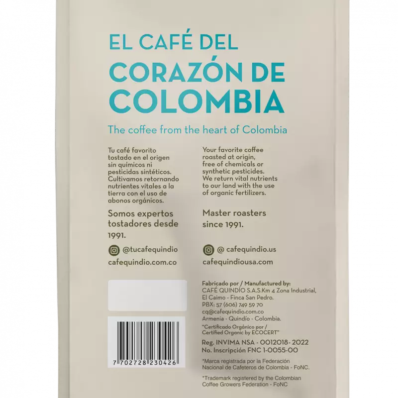 What was born as a dream, is now a reality, one in which over 400 employees work fully committed to offer you the best cup of coffee from local coffee growers roasted and packed at origin. Quindío State, from where our name comes from, is located is the center of Colombia, that´s why we call ourselves the “Coffee from the Heart of Colombia”. This strategic location gives our State the privilege of having flat terrain as well as the majestic Andes Mountains. This difference in altitudes, allows the region to offer different varieties of Arabica coffee, each with its unique characteristics of flavor, notes, body and texture. Gourmet Coffee, also known as our “House Blend”, is a blend of different varieties of coffee harvested at around 6200 feet above sea level (1900 m.a.s.l.), giving it its unique chocolate and panela flavor notes. Its medium roast with its medium-low acidity, offers you a cup of coffee with a high fragrance body and an intense chocolate scent. By buying this coffee, you are contributing to the well-being of many local and small coffee growers in the well-known “Coffee Triangle” of Colombia, where coffee tradition is still the staple of this magical region