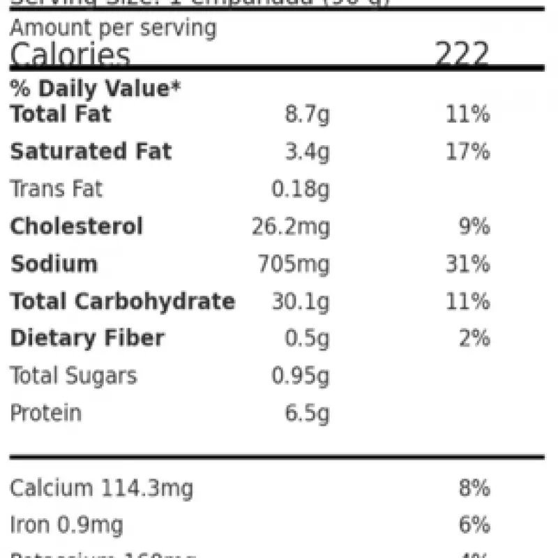 • Our Argentinian Chicken Empanadas are filled with seasoned shredded chicken, sautéed vegetables, and traditional spices, all wrapped in a handmade-style dough. Made in a USDA and FDA certified facility, they’re free from preservatives—bringing authentic Latin flavor to your table.