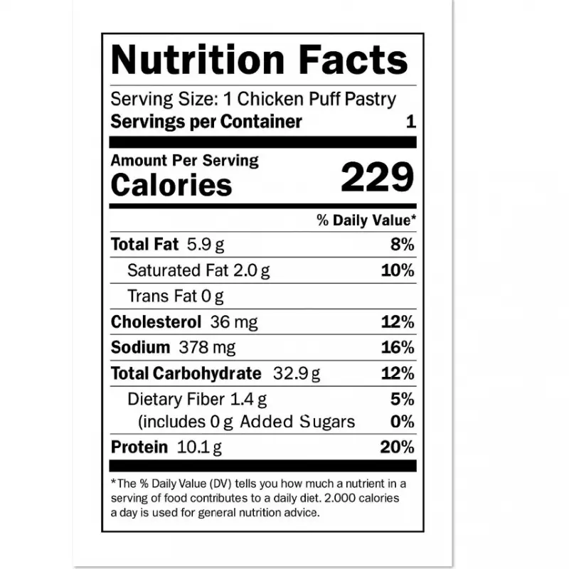 • Our Chicken Puff Pastries are filled with tender chicken breast, seasoned with natural spices and fresh ingredients, then wrapped in a light, flaky pastry. Made in a USDA and FDA certified facility, they contain no additives or preservatives—just pure, delicious quality you can trust.