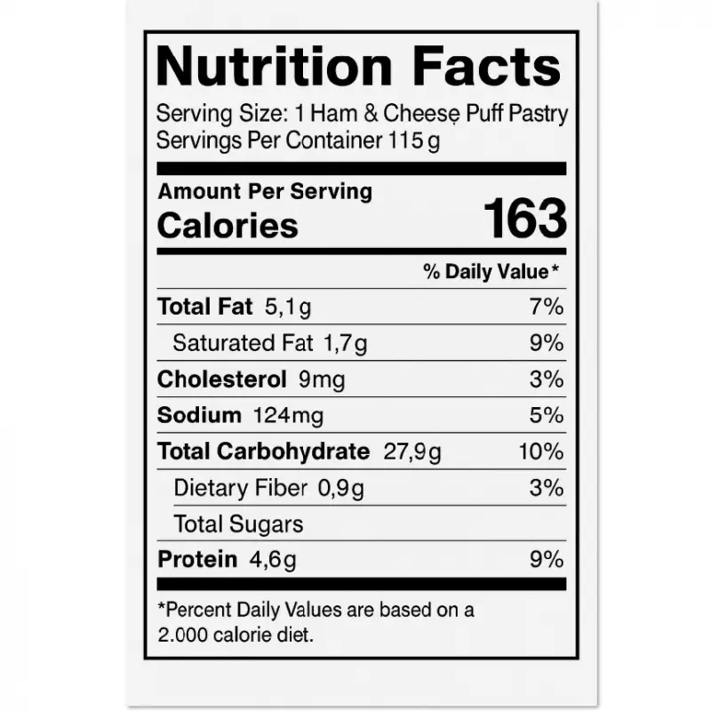 • Our Ham & Cheese Puff Pastries are filled with premium cured ham and rich white cheese, wrapped in a buttery, flaky pastry. Made in a USDA and FDA certified facility, they are free from preservatives and additives—offering a perfect balance of flavor and quality in every bite.
